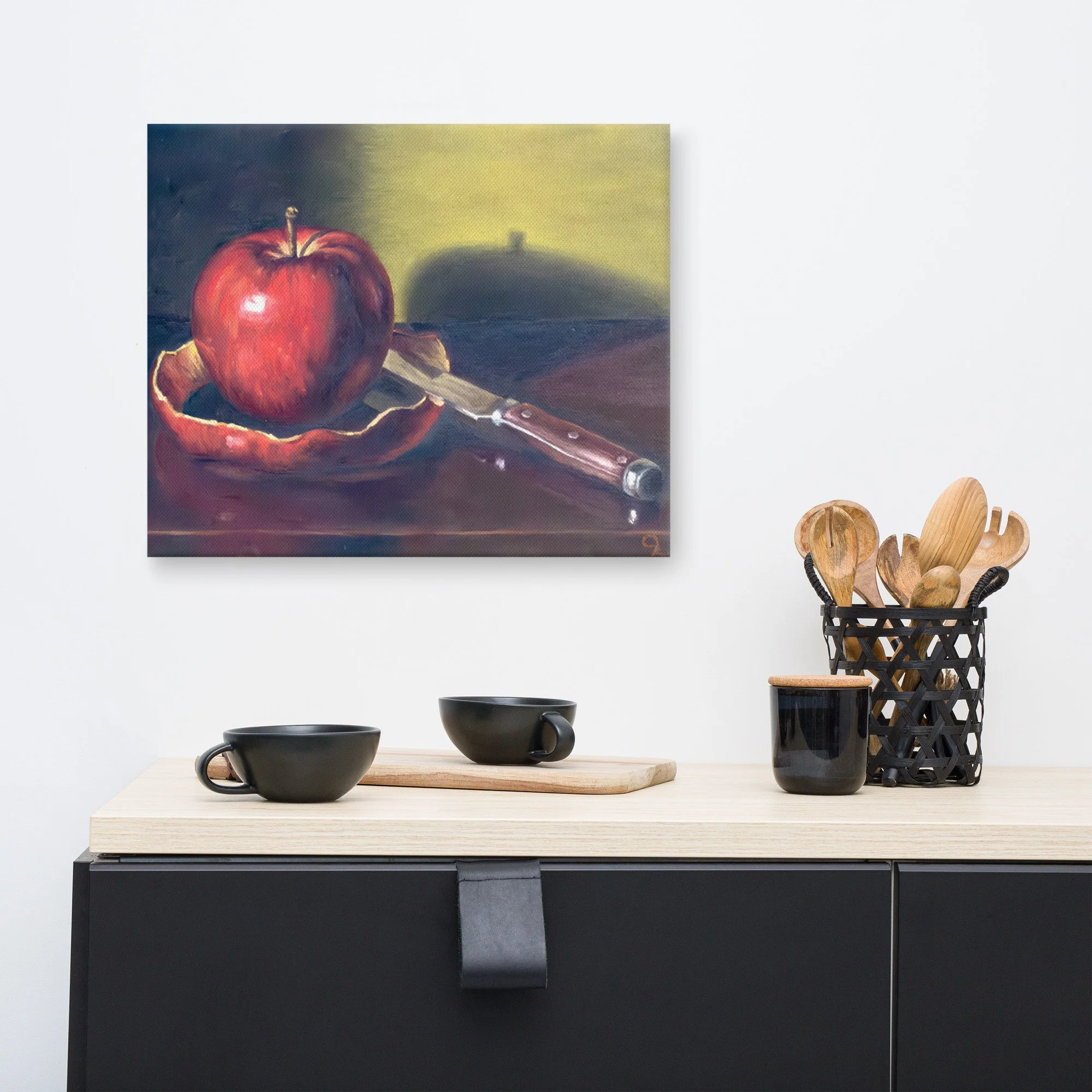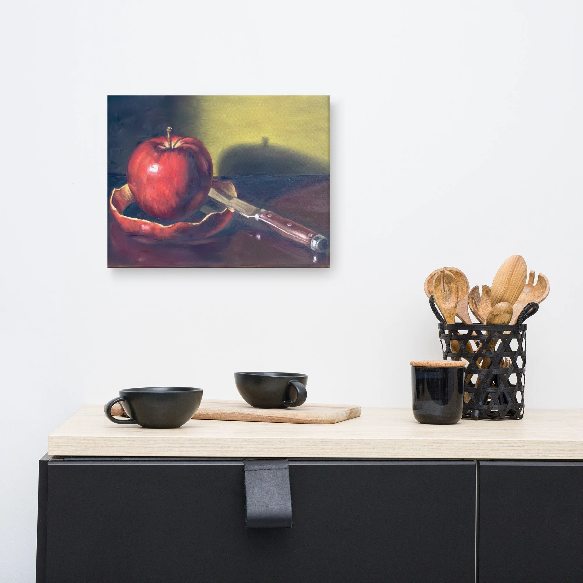 This striking still life captures a quiet moment of transformation and the passage of time. The composition features a brilliantly red, partially peeled apple resting alongside a classic wooden-handled paring knife on a highly reflective surface. The curling, continuous apple peel adds a sense of graceful movement and unfolding narrative to the piece.